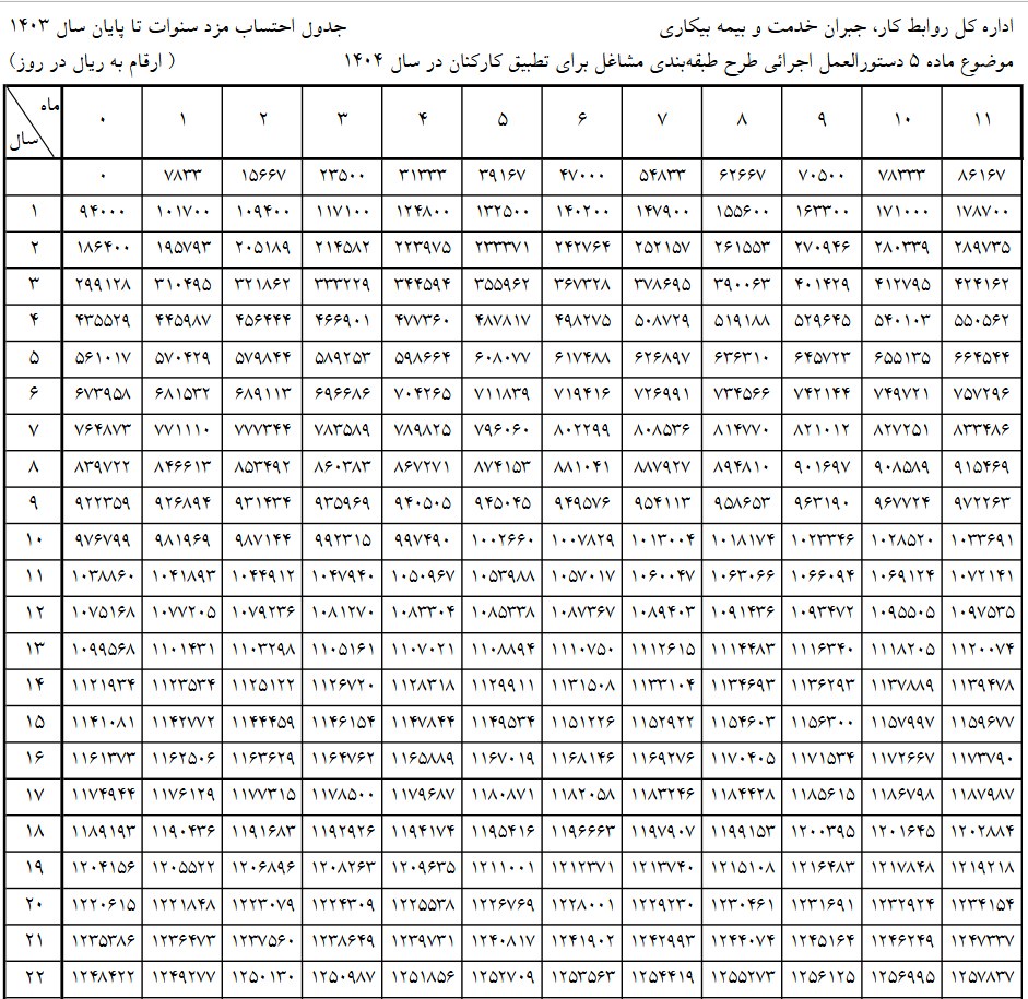 همچنین از اول سال ۱۴۰۴ سایر سطوح مزدی نیز روزانه ۳۲ درصد مزد ثابت یا مزد مبنا موضوع ماده ۳۶ قانون کار به اضافه روزانه ۳۱۰ هزار و ۵۳۵ ریال به نسبت آخرین مزد در سال ۱۴۰۳ افزایش می‌یابد.