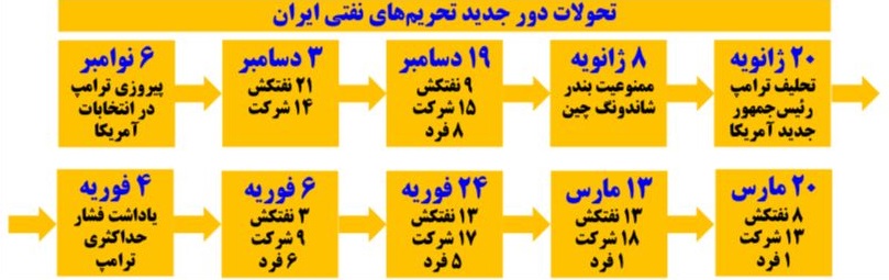 از موعد پیروزی دونالد ترامپ در انتخابات ریاست جمهوری آمریکا در6 نوامبر سال 2024، تحریمهای دولت این کشور تشدید شده و6 بسته تحریمی علیه نفتکشها، شرکتها و افراد مرتبط با نفت ایران اعمال شده است که 2 بسته مربوط به دوره بایدن و4 بسته مربوط به دوره جدید ترامپ میباشد.