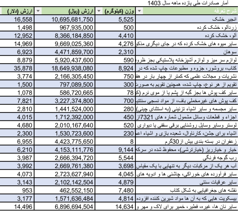 تحلیل اطلاعات گمرک نشان میدهد ایران در ۱۱ ماه از سال ۱۴۰۳، ۲۴ قلم کالا به آمریکا صادر کرده است.
