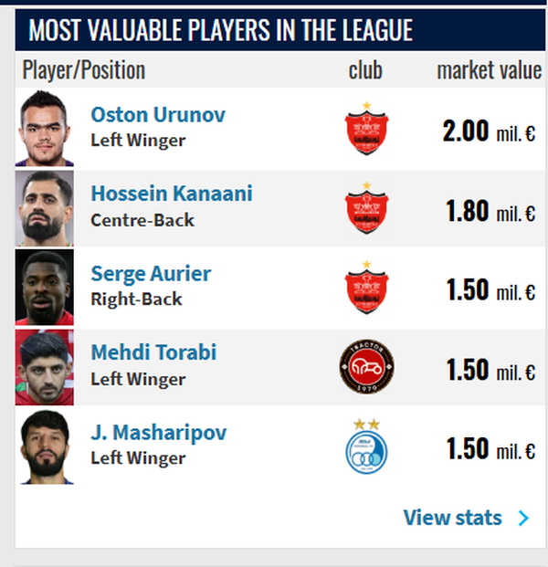 بر اساس آمار ترانسفرمارکت، از ۵ فوتبالیست گران‌قیمت لیگ ایران از رده اول تا سوم ارزشمندترین‌ها در ترکیب پرسپولیس حضور دارند.