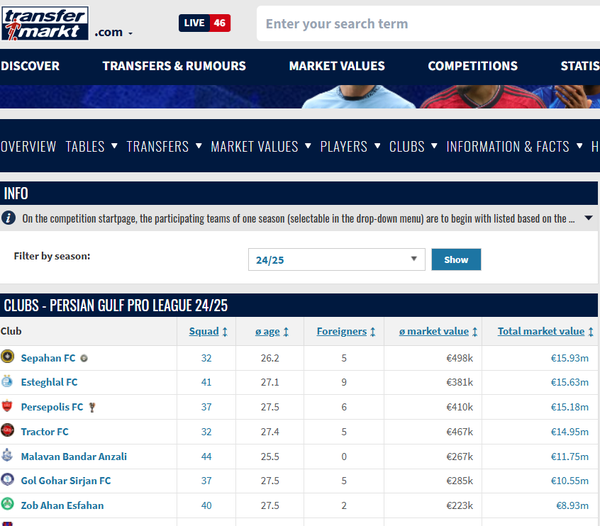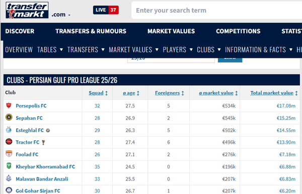 سایت ترانسفرمارکت گران‌ترین تیم‌های لیگ برتر ایران را معرفی کرد.