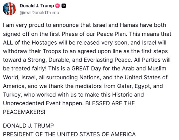 ترامپ در شبکه اجتماعی «تروث سوشال» نوشت که دو طرف بر سر مرحله اول طرح صلح آمریکا به توافق رسیده‌ و گروگان‌ها به‌زودی آزاد خواهند شد.