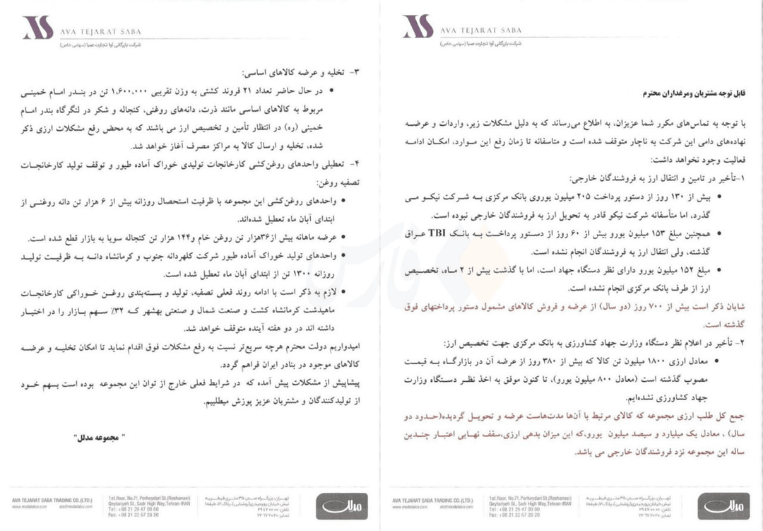به گزارش دولت بهار به نقل از فارس؛ وارادات و عرضه نهاده‌های دامی «به ناچار» متوقف شده و تا زمان رفع مشکلات امکان ادامه فعالیت وجود ندارد. این بخشی از نامه مجموعه مدلل خطاب به مشتریان و مرغداران است.