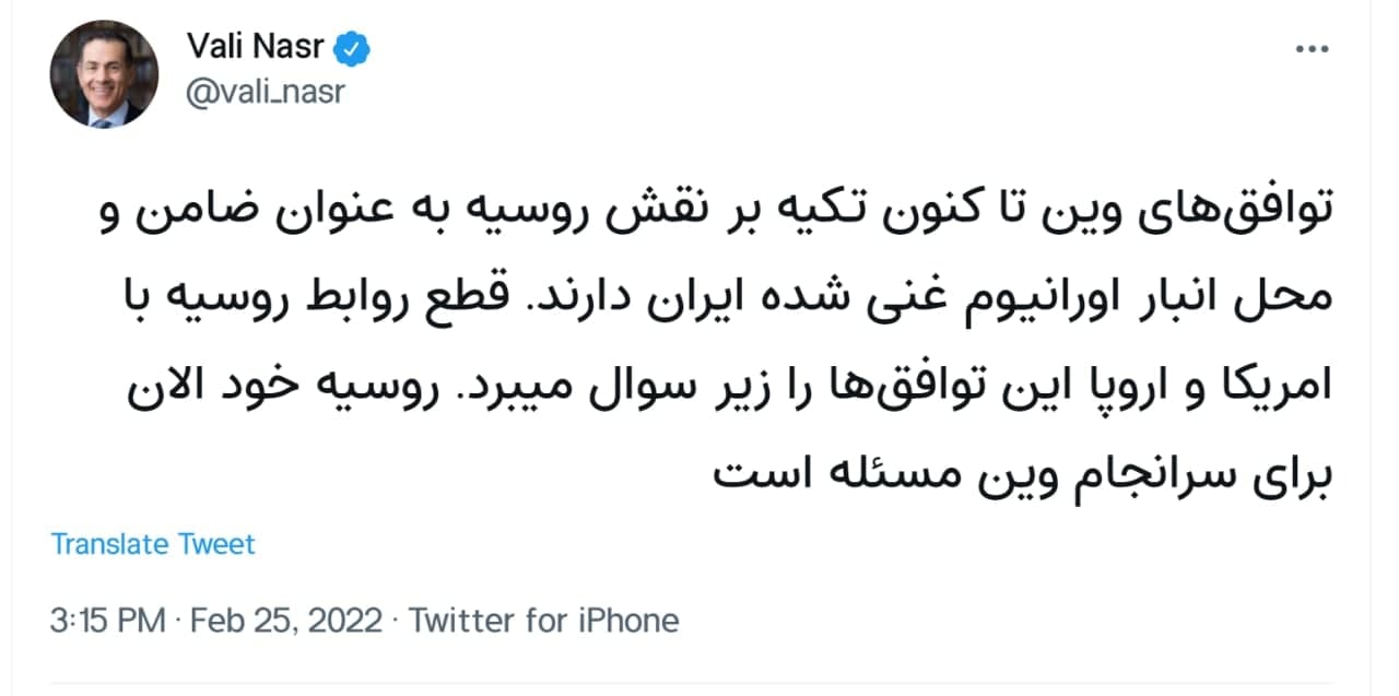 به گزارش دولت بهار، ولی نصر، عضو شورای روابط خارجی آمریکا در توئیتی نوشت: