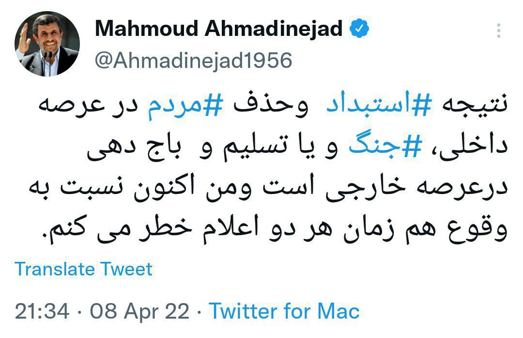 به گزارش دولت بهار، دکتر احمدی نژاد در توییتی نوشت: نتیجه استبداد و حذف مردم در عرصه داخلی، جنگ و یا تسلیم و باج دهی در عرصه خارجی است و من اکنون نسبت به وقوع هم زمان هر دو اعلام خطر میکنم.