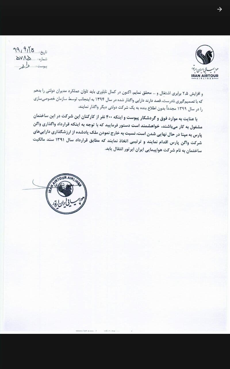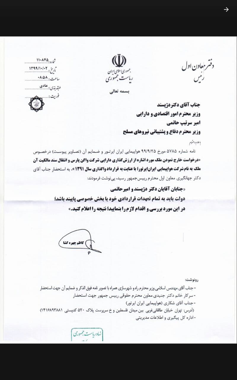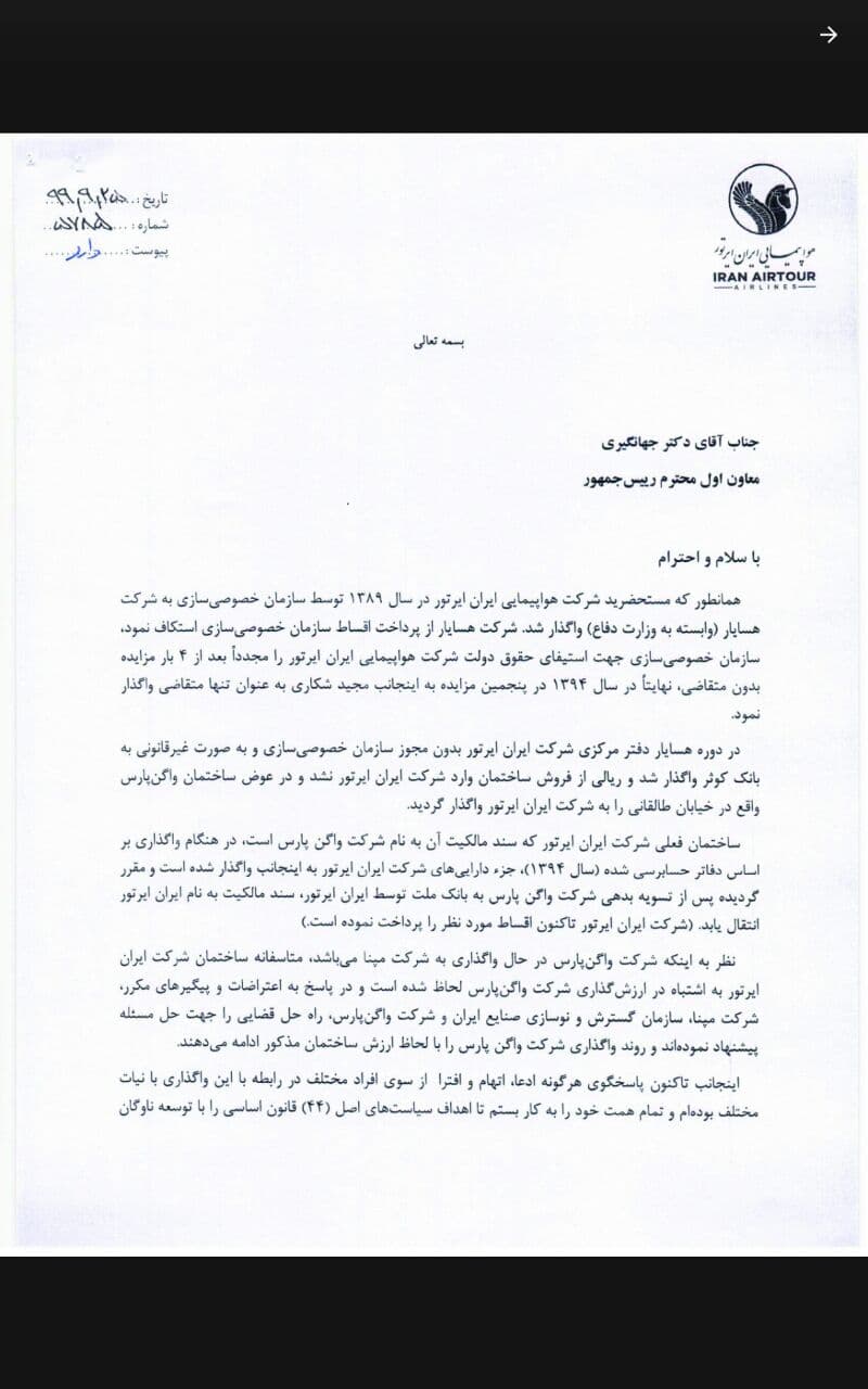 ثانیاً خریدار، سهام شرکت را خریداری نموده است نه اموال و اموال به نام شرکت است نه به نام خریدار، ثالثاً تنها مکاتبه ای که تاکنون از طرف خریدار در این 6 سال بعد از واگذاری با معاون اول محترم رئیسجمهور انجام گرفته، در خصوص ساختمان دفتر مرکزی شرکت ایران ایرتور است که جهت تنویر افکار عمومی متن نامه این شرکت و دستور معاون اول محترم رئیسجمهور منتشر میشود و قضاوت در این زمینه را به مخاطب واگذار میکنیم.